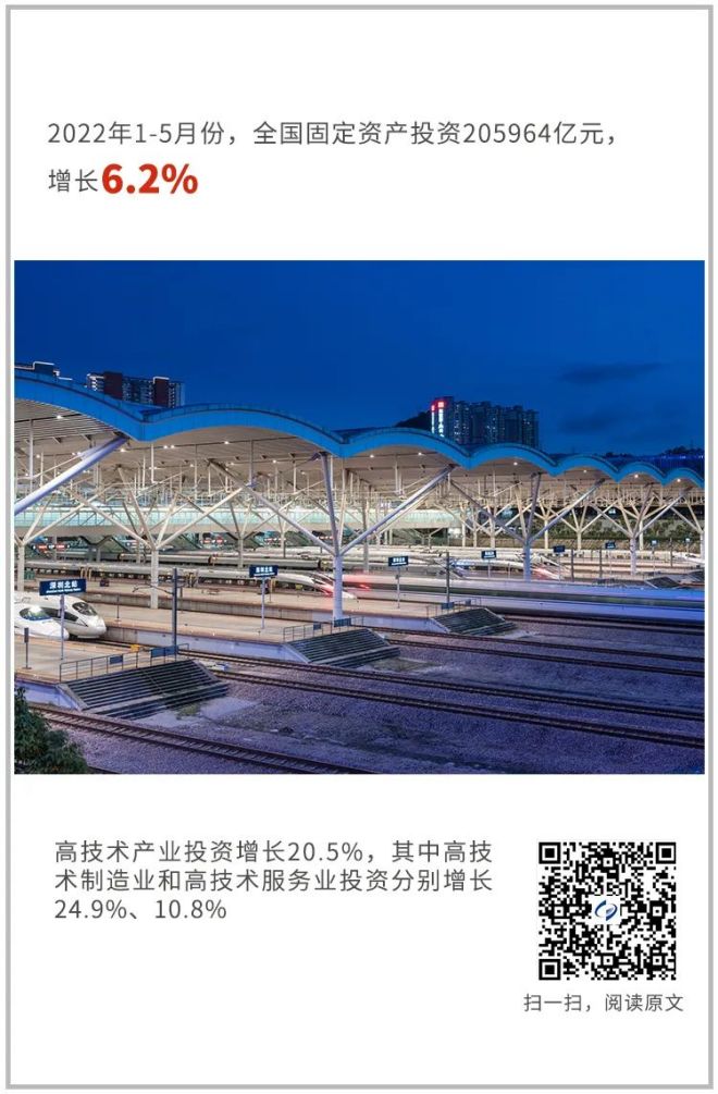 1-5月份,全國固定資產投資(不含農戶)205964億元,同比增長6.2%;5月份環比增長0.72%。分領域看,1-5月份基礎設施投資同比增長6.7%,製造業投資增長10.6%,房地產開發投資下降4.0%。全國商品房銷售麵積50738萬平方米,同比下降23.6%;商品房銷售額48337億元,下降31.5%。