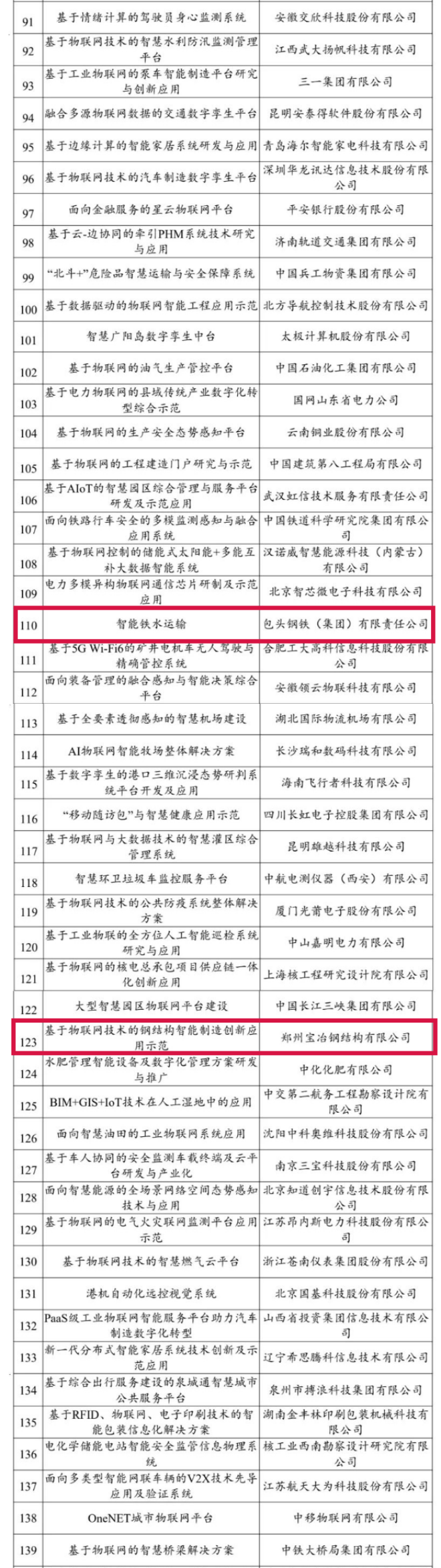 從《通知》中獲悉,按照《物聯網新型基礎設施建設三年行動計劃(2021-2023年)》要求,經組織推薦、綜合評審和網上公示等環節,工業和信息化部確定了2021年物聯網示範項目名單,現予以公布。涉及鋼鐵相關企業共6家上榜,具體如下——