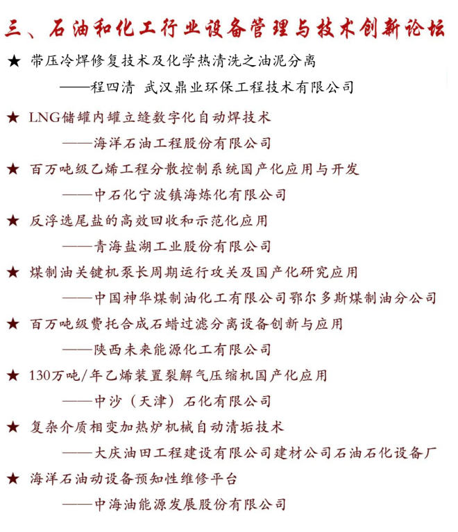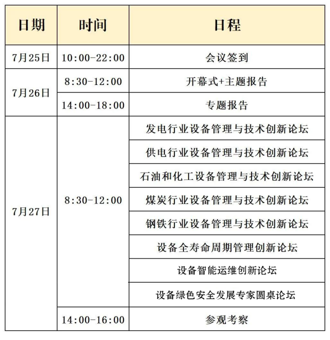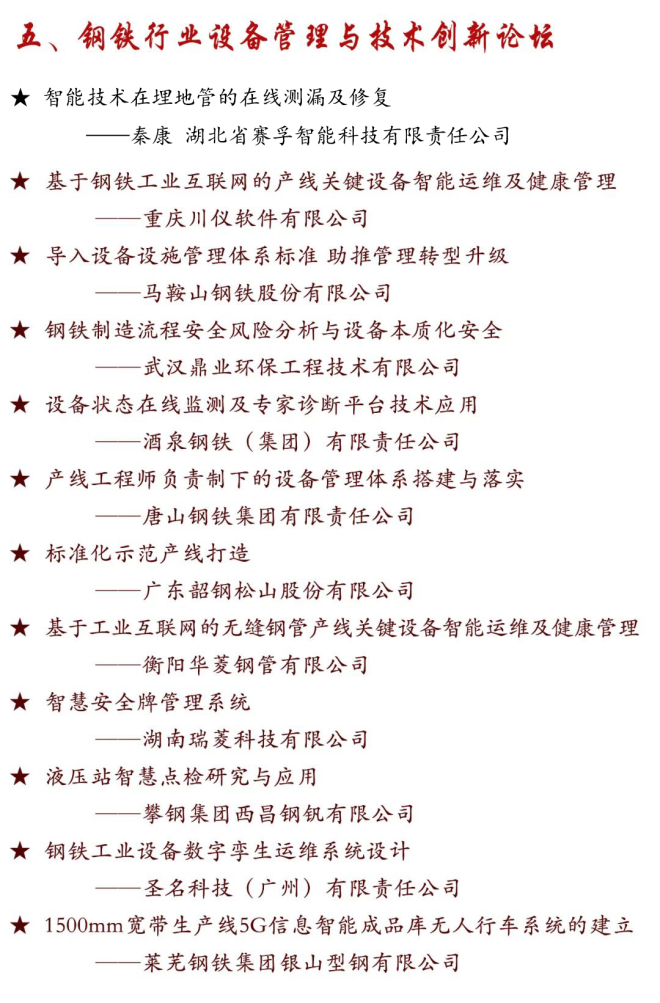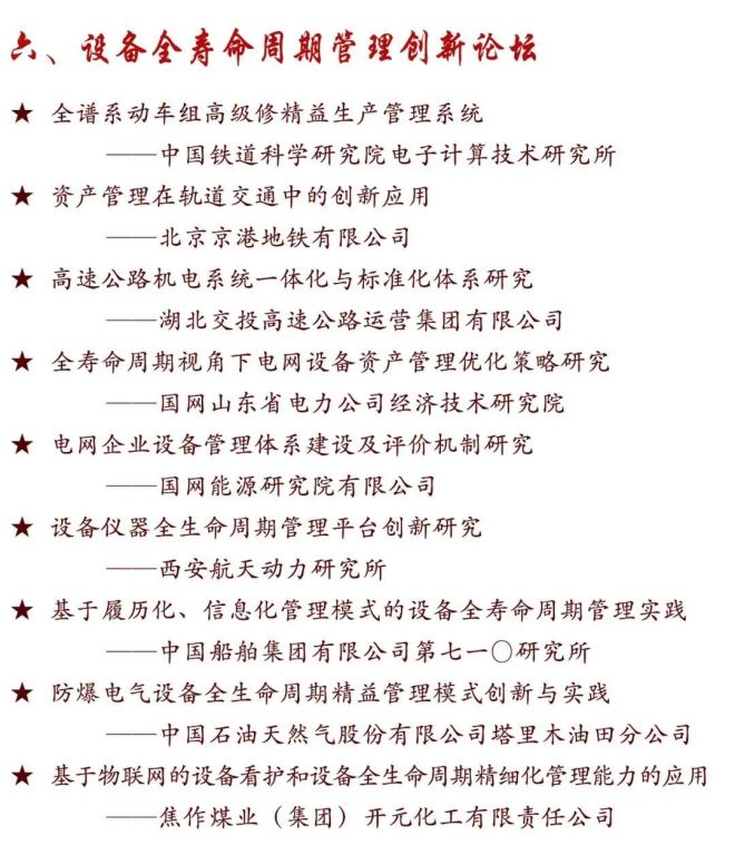 會議主題:創新引領高質量發展,助力構建新發展格局。會議包含國家及地方有關部門領導講話、院士專家主旨演講、發布第五屆全國設備管理與技術創新成果,展示交流創新成果;獲得本屆創新成果項目單位作大會經驗交流;舉辦電力、石油化工、煤炭、鋼鐵行業以及設備全壽命、設備智能運維及數字經濟等專業論壇。