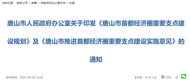 8月4日,唐山市人民政府網站發布了唐山市人民政府辦公室關於印發了《唐山市首都經濟圈重要支點建設規劃》(以下簡稱《規劃》)及《唐山市推進首都經濟圈重要支點建設實施意見》(以下簡稱《意見》)的通知。