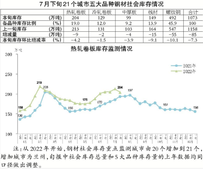 7月下旬,21個城市五大品種鋼材社會庫存為1073萬噸,環比減少85萬噸,下降7.3%,庫存降幅擴大;比6月下旬減少179萬噸,下降14.3%;比今年初增加285萬噸,上升36.2%;比去年同期減少149萬噸,下降12.2%。
