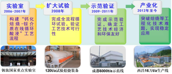 2006年,鞍鋼集團攀鋼研究院先後與重慶大學、武漢科技大學等聯手,以國家“十一五”kejizhichengjihuaweiyituo,zhenduichuantongnayantifangongyiheshihuitifangongyicunzaidewenti,jiyuyuantoujianpaidedingcengshejisilu,tongguolilunfenxihedaliangshiyanshishiyanyijinianchuli120噸標準釩渣全流程擴大試驗,構建了“釩渣鈣化焙燒—銨介質在線循環”提釩新工藝;以6000噸釩渣/a清(qing)潔(jie)提(ti)釩(fan)示(shi)範(fan)線(xian)為(wei)平(ping)台(tai),完(wan)成(cheng)了(le)工(gong)業(ye)規(gui)模(mo)的(de)全(quan)流(liu)程(cheng)試(shi)驗(yan)驗(yan)證(zheng)和(he)技(ji)術(shu)經(jing)濟(ji)評(ping)估(gu),確(que)定(ding)了(le)工(gong)藝(yi)技(ji)術(shu)的(de)可(ke)行(xing)性(xing)。在(zai)此(ci)基(ji)礎(chu)上(shang),設(she)計(ji)新(xin)建(jian)了(le)年(nian)處(chu)理(li)16萬噸釩渣的攀鋼西昌釩製品公司,攻克了焙燒黏結和浸出裝備研發等工程化技術難題,成功實現新工藝產業化轉化;同時,從末端治理和高值資源回收的角度,實現了廢棄物中錳、鐵、釩資源有效利用,最終形成了釩資源綠色高效利用係列關鍵技術。