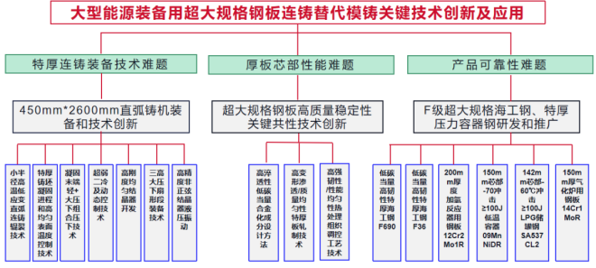 通過“關鍵裝備+核心技術+係列產品”的全流程創新,首創國際最大斷麵450×2600mm直弧型連鑄成套裝備與工藝;完成了直弧型板坯連鑄代替模鑄鋼錠工藝生產超大規格高品質能源用鋼的高效低耗製造技術創新及應用,突破了連鑄工藝生產超大規格能源用鋼板核心技術瓶頸,推動了我國中厚板領域由鋼鐵製造大國向鋼鐵製造強國的轉變。