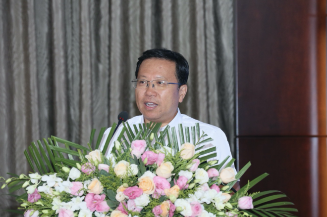 圖為楊憲禮作《政產學研協同創新,實現新鋼鐵低碳數字化發展》報告