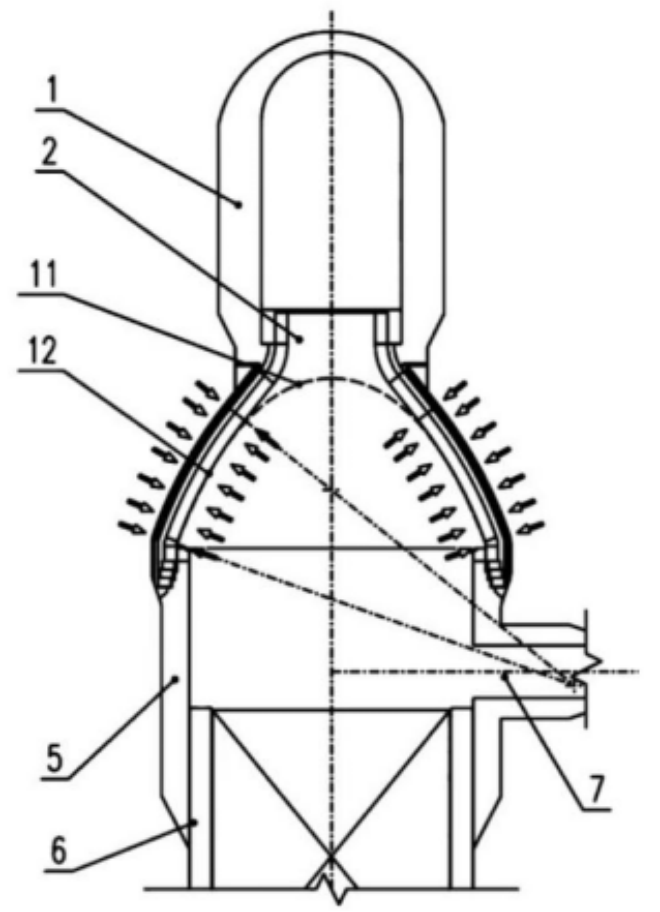 近jin年nian來lai,國guo內nei外wai熱re風feng爐lu設she計ji專zhuan家jia及ji其qi團tuan隊dui殫dan精jing竭jie慮lv,設she計ji踐jian行xing出chu不bu少shao先xian進jin適shi用yong且qie符fu合he煉lian鐵tie生sheng產chan安an全quan實shi際ji的de長chang壽shou高gao風feng溫wen熱re風feng爐lu結jie構gou,推tui動dong我wo國guo熱re風feng爐lu安an全quan生sheng產chan登deng上shang了le新xin台tai階jie。例li如ru,首shou鋼gang一yi級ji科ke學xue家jia,京jing唐tang鋼gang鐵tie公gong司si總zong設she計ji師shi、京唐鋼鐵公司煉鐵設備專家、zonggongchengshizhangfumingjiaoshoujiehechangqiwendingyunxingdeguowaidulixuanlianxianranshaoshijiegouherefengludulizhuixinggongdingjiegoudeyouyuejishutedian,jiehexianyoudingranshirefenglulukekailieherefengchukousunhuaikuatadengshijianyanjiu,famingle《頂燃式熱風爐圓弧擬合懸鏈線獨立拱頂結構》新的技術成果(圖3),受到了煉鐵界的歡迎。該設計成果是對現有受力不合理的頂燃式熱風爐錐形拱頂(圖 1、圖2)實施了圓弧擬合懸鏈線結構(圖3)和獨立支撐拱頂的受力改進(圖4)。