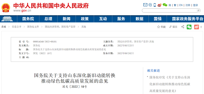 近日,中華人民共和國中央人民政府網站發布了《國務院關於支持山東深化新舊動能轉換推動綠色低碳高質量發展的意見》(以下簡稱《意見》)。