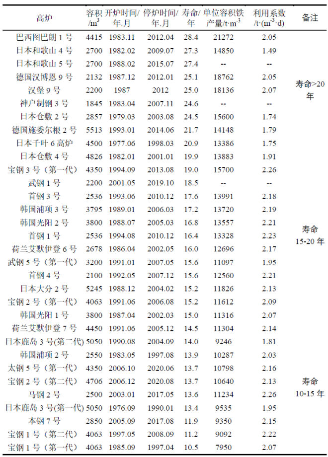 表1-1 國內外長壽高爐壽命及指標
