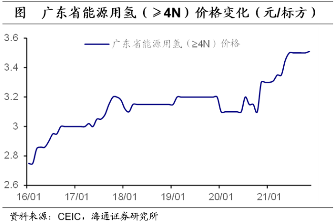 二是製取、儲運技術薄弱,綠氫價格短期或將較高。從縱向比較上看,我國僅有廣東省公布了自2016年以來能源用氫的價格,可以看到近年來一直保持上漲的趨勢。從橫向比較上看,2021年上半年,德國氫氣價格為74.4元/公斤,美國為106.35元/公斤,日本為70元/公斤,而中國僅為60-70元/公斤。