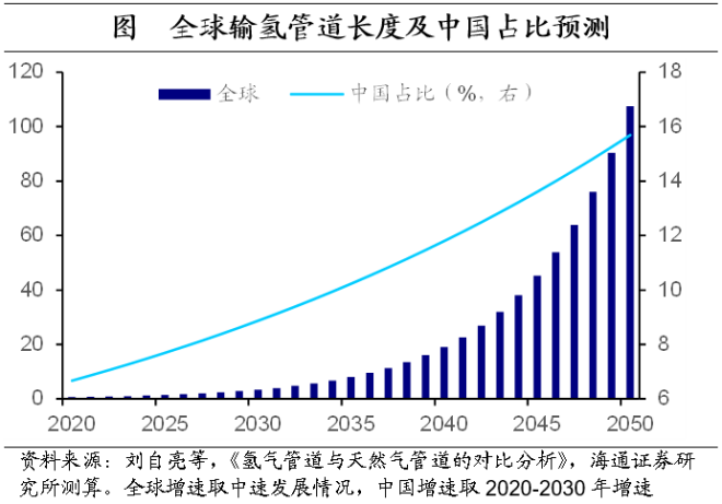 在儲運的基礎設施上,氫氣管網建設有較大的發展空間。工業氫氣運輸主要以管道形式為主,低壓管道運氫適合大規模、長距離的情況,在未來有極大的需求。全球在2020年共建成輸氫管道6000公裏,其中,中國僅有400公裏,占比為6.7%。而根據劉自亮等的研究,預計在中速發展的情況下,到2050年全球將建成長距離和短距離輸氫管道7.5萬和100萬公裏,年均增速約為18.9%。中國預計到2030年將建成氫氣管道3000公裏,年均增速為22.3%,較全球增長更快。