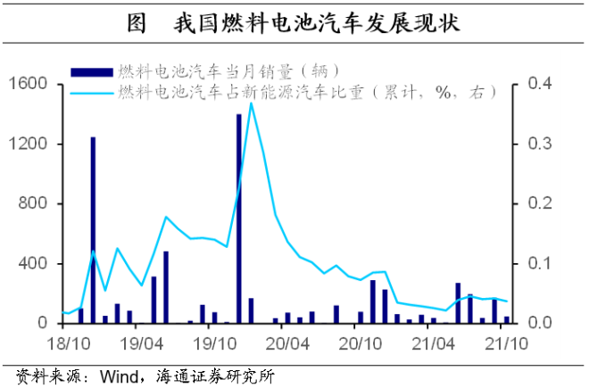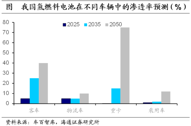 氫燃料電池在交通運輸行業中的應用是未來的重要增長點。目前我國燃料電池汽車占新能源汽車銷量的比重最高也不超過0.4%。其中,截至2020年8月,燃料電池車主要以物流車和客車為主,乘用車占比僅為0.1%,且主要用於租賃。根據車百智庫的預測,氫燃料電池汽車保有量將在2025、2035和2050年分別達到10萬、100萬和3000萬輛,年均增速約為25.6%,主要應用於重卡、客車等大型車輛中,在乘用車中的滲透率也將提高到12%。