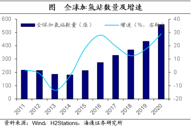 而氫燃料汽車的廣泛應用,還需要基礎設施,如加氫站的配套建設。截至2020年底,全球共建成加氫站約544座,其中我國128座,占比約為23.5%。根據《中國氫能與燃料電池白皮書(2019)》預測,我國加氫站數量在2035年將達到1500座,在2050年將達到10000座以上,為實現這一目標,加氫站數量的年均增速達15.6%。ergenjuxiangchengyanjiuhuitongjideqingkuang,dangqianwoguojiaqingzhanjianshedesuduzaiquanqiulingxian,zaijianshuliangyuanchaoqitaguojiahediqu,keyiyujianzaijinqi,woguojiangjixutuijinqingnengjichusheshilingyujianshe。