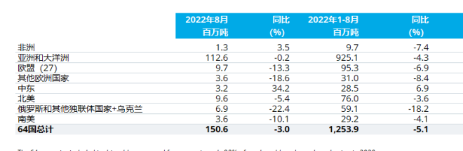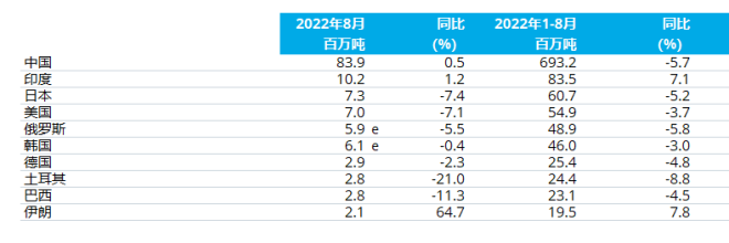 2022年8月,全球64個納入世界鋼鐵協會統計國家的粗鋼產量為1.506億噸,同比下降3.0%。