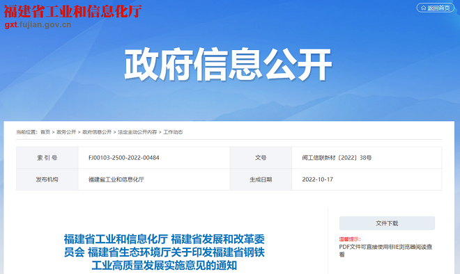 近日,福建省工業和信息化廳網站發布了《福建省工業和信息化廳 福建省發展和改革委員會 福建省生態環境廳關於印發福建省鋼鐵工業高質量發展實施意見的通知》(以下簡稱《通知》)。