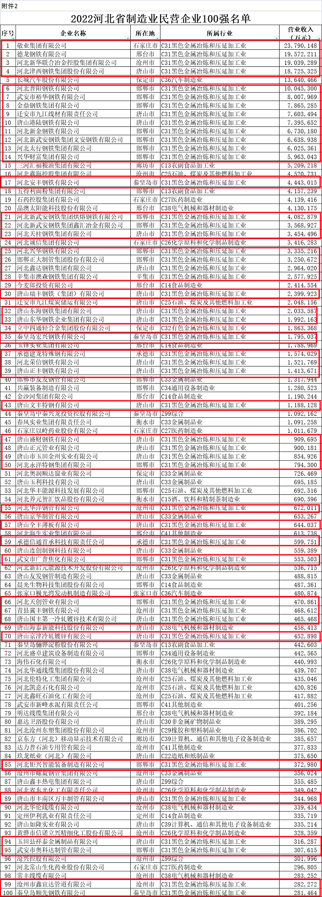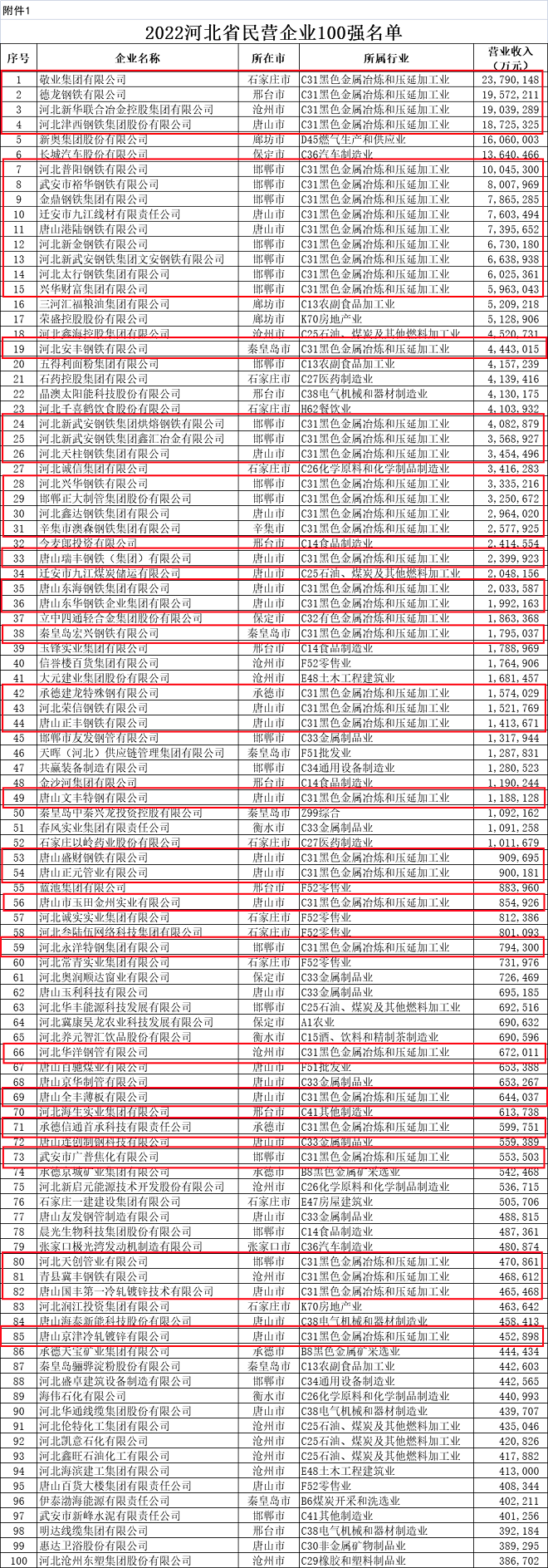11月3日,河北省工商聯網站發布了2022河北省民營企業100強、製造業民營企業100強、服務業民營企業100強和民營企業社會責任100強榜單。