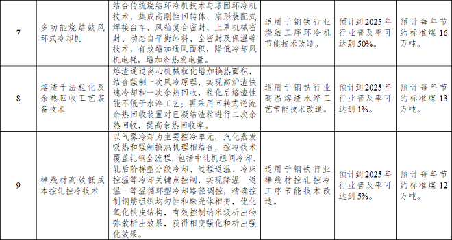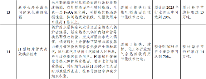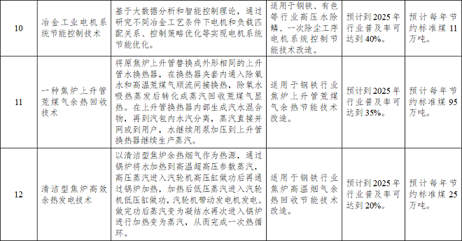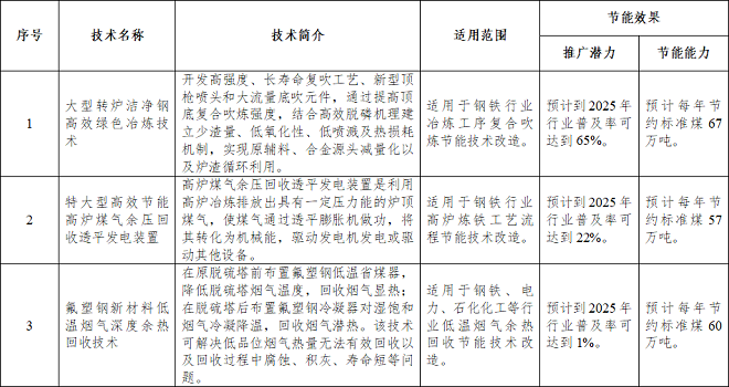 《目錄》涉及工業節能技術、信息化領域節能技術、高效節能裝備三個方麵。其中,工業節能技術中的鋼鐵行業節能提效技術共14項,具體情況如下——