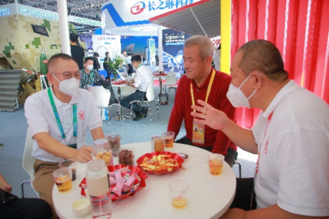航天英雄楊利偉(左三)蒞臨展位,與披堅執銳新材料團隊帶頭人董瀚教授等領導交流