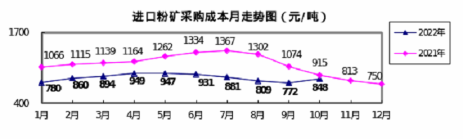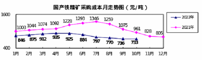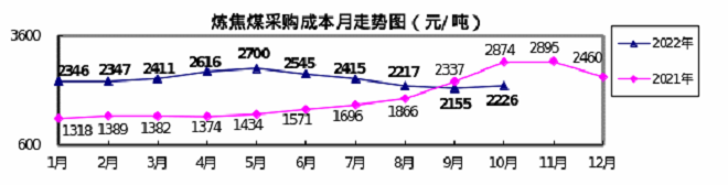 2022年10月,煤焦、進口礦等采購成本由降轉升,生鐵和廢鋼采購成本小幅下降。