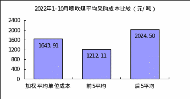 噴吹煤10月份加權平均折算成幹基的采購成本為1786.70元/噸,環比升高225.87元/噸,升幅為14.47%。1-10月累計平均折算成幹基的采購成本為1643.91元/噸,同比升高407.97元/噸,升幅為33.01%。