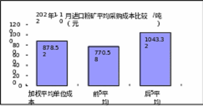 1-10月對標企業進口粉礦折算成62%品位的平均采購成本為878.52元/噸,成本最低的前5家企業的加權平均采購成本為770.58元/噸,比對標企業平均采購成本低107.94元/噸,低於平均采購成本12.29%;而采購成本最高的5家企業加權平均采購成本為1043.32元/噸,比對標企業平均采購成本高164.80元/噸,高於平均采購成本18.76%。
