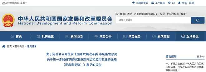 11月23日,國家發展和改革委員會網站發布了關於向社會公開征求《國家發展改革委 市場監管總局關於進一步加強節能標準更新升級和應用實施的通知(征求意見稿)》意見(以下簡稱《征求意見稿》)的公告一文,向社會公開征求意見,並提出組織實施“十四五”百項節能降碳標準提升行動。