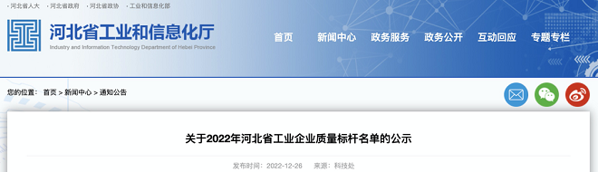 12月26日,河北省工信廳網站發布了《關於2022年河北省工業企業質量標杆名單的公示》(以下簡稱《公示》)。