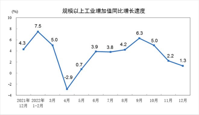 12月份,規模以上工業增加值同比實際增長1.3%(增加值增速均為扣除價格因素的實際增長率)。從環比看,12月份,規模以上工業增加值比上月增長0.06%。2022年,規模以上工業增加值比上年增長3.6%。