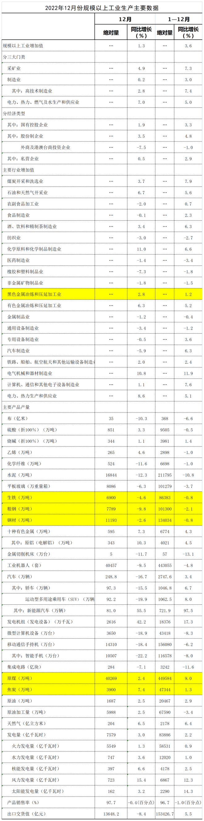 分行業看,12月份,41個大類行業中有16個行業增加值保持同比增長。其中煤炭開采和洗選業增長3.7%,石油和天然氣開采業增長6.7%,農副食品加工業下降2.0%,酒、飲料和精製茶製造業增長3.4%,紡織業下降3.0%,化學原料和化學製品製造業增長11.0%,非金屬礦物製品業下降1.8%,黑色金屬冶煉和壓延加工業增長2.8%,有色金屬冶煉和壓延加工業增長6.3%,通用設備製造業下降3.4%,專用設備製造業下降0.5%,汽車製造業下降5.9%,鐵路、船舶、航空航天和其他運輸設備製造業增長2.0%,電氣機械和器材製造業增長10.8%,計算機、通信和其他電子設備製造業增長1.1%,電力、熱力生產和供應業增長8.6%。