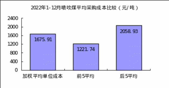 噴吹煤12月份加權平均折算成幹基的采購成本為1808.31元/噸,環比下降54.28元/噸,降幅為2.91%。1—12月累計平均折算成幹基的采購成本為1675.91元/噸,同比升高327.72元/噸,升幅為24.31%。