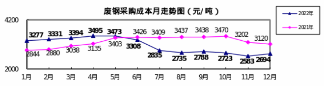 廢鋼12月份加權平均采購成本為2694.17元/噸,環比升高110.88元/噸,升幅為4.29%。1—12月累計平均采購成本為3088.50元/噸,同比下降151.21元/噸,降幅為4.67%。