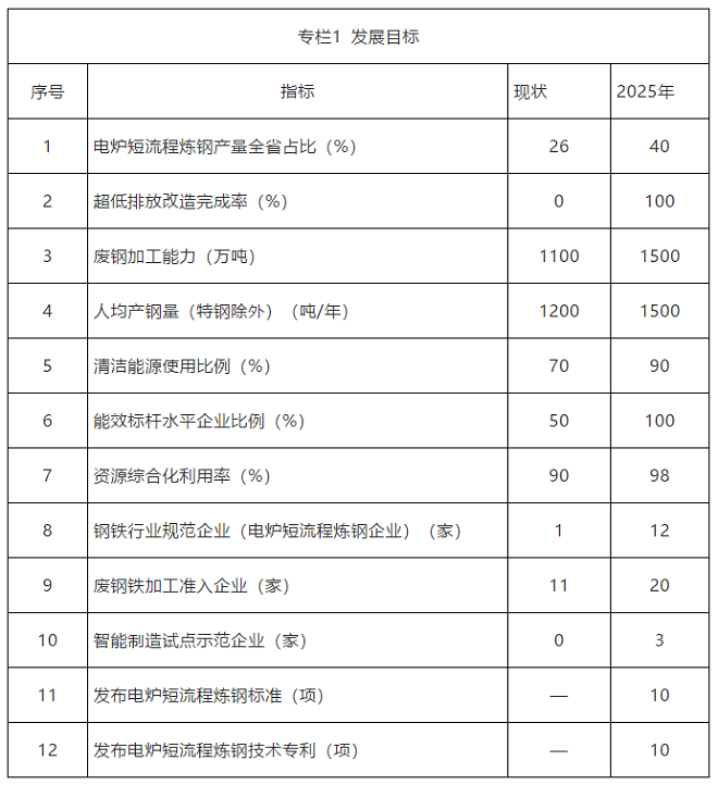(三)主要目標。嚴禁違規新增鋼鐵產能,嚴防“地條鋼”死灰複燃和已化解過剩產能複產,優化存量產能,發展電爐短流程煉鋼,促進產業結構轉型。到2025年,四川省電爐短流程煉鋼基本形成先進企業集群化發展、綠色低碳循環體係完善、資源保障能力顯著提升、智能化數字化水平先進的發展格局,探索綠色、智能、創新、高效、協調的發展模式,總結一批新工藝、新技術、新標準實踐經驗,助力全國鋼鐵行業綠色低碳轉型和高質量發展。
