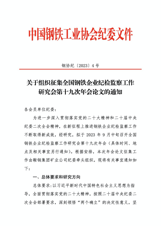 關於組織征集全國鋼鐵企業紀檢監察工作研究會第十九次年會論文的通知