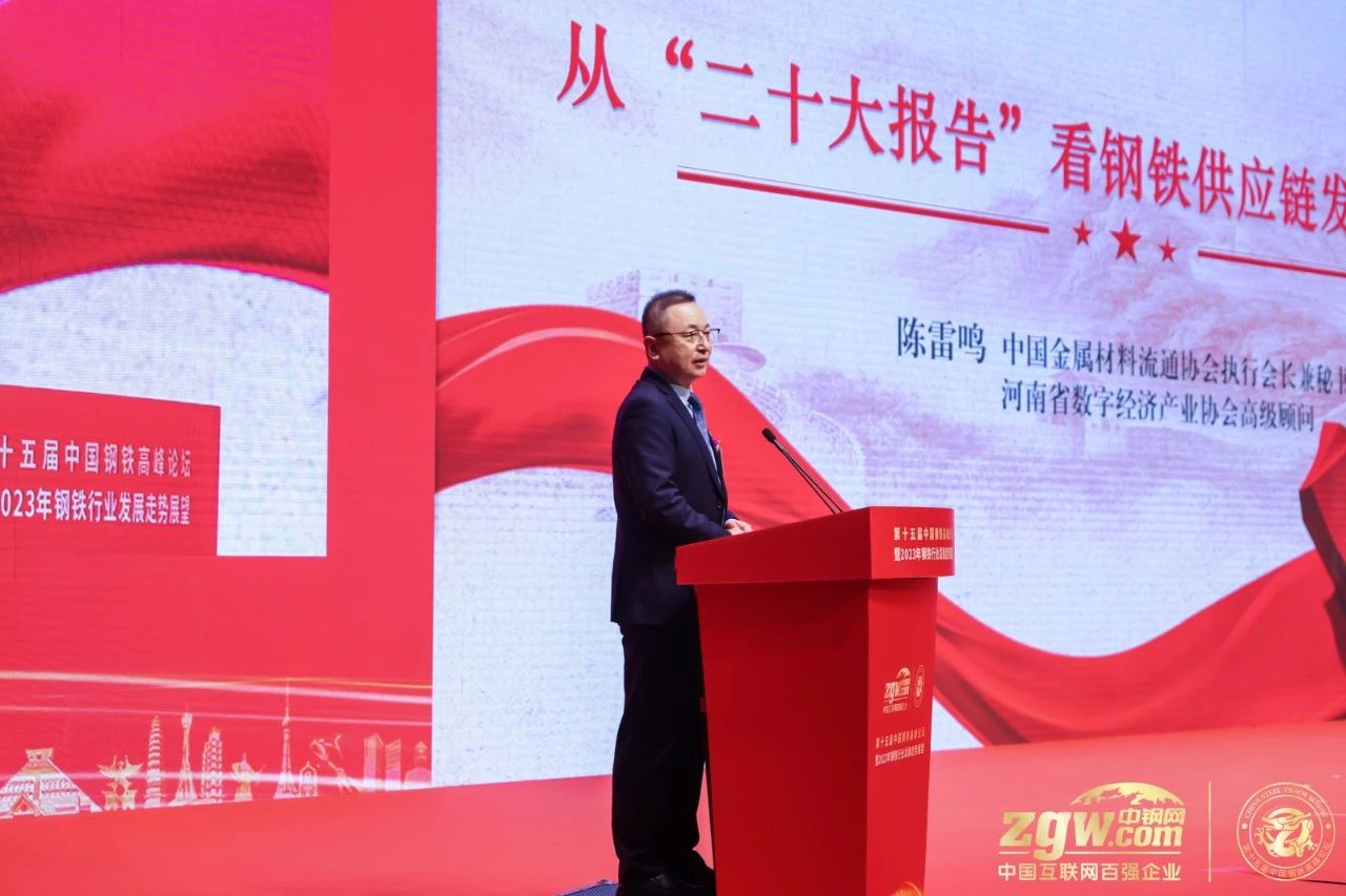 陳雷鳴分析了黨的二十大報告中展現出的鋼鐵供應鏈發展新機遇。他以實體經濟、製造強國、質量強國、數字中國、高質量發展、深化供給側結構性改革、市場在資源配置中的決定性作用、提升產業鏈供應鏈韌性和安全水平、區域協調發展戰略、新型城鎮化戰略、建設貿易強國、“一帶一路”與“高水平對外開放”、“雙循環”新發展格局、創新驅動發展戰略、人才強國戰略、“綠色發展”和“碳達峰碳中和”等關鍵詞分析了這些機遇。他表示,鋼鐵行業目前麵臨“新一輪危機”,但這是行業發展的必由之路。