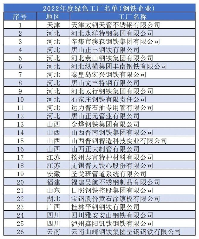 3月24日,工業和信息化部網站公布了最終確定的2022年度綠色製造名單。根據該名單,2022年度確定的鋼鐵企業“綠色工廠”有26家,加上之前分6批公布的名單(撤銷1家),我國鋼鐵企業“綠色工廠”增至116家。