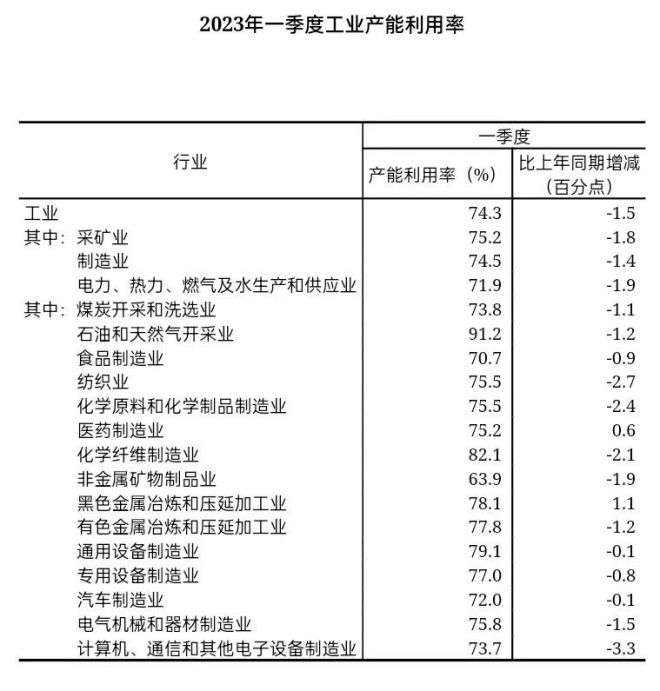一季度,全國工業產能利用率為74.3%,比上年同期下降1.5個百分點,比上季度下降1.4個百分點。