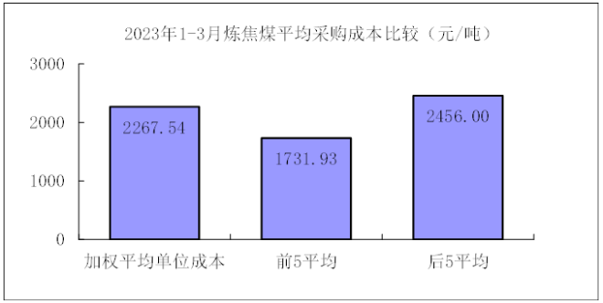 1—3月對標企業煉焦煤平均采購成本最低的前5家企業折算成幹基的加權平均采購成本為1731.93元/噸,比對標企業平均采購成本低535.61元/噸,低於平均采購成本23.62%;而采購成本最高的5家企業的加權平均采購成本為2456.00元/噸,比對標企業平均采購成本高188.45元/噸,高於平均采購成本8.31%。