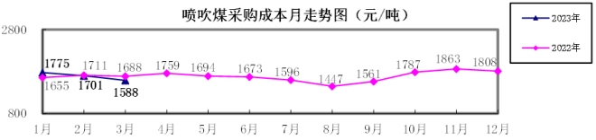 噴吹煤3月份加權平均折算成幹基的采購成本為1587.94元/噸,環比下降113.34元/噸,降幅為6.66%。1—3月累計平均折算成幹基的采購成本為1689.57元/噸,同比升高11.36元/噸,升幅為0.68%。