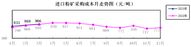 進口粉礦3月份加權平均采購成本906.05元/噸,環比升高37.65元/噸,升幅為4.34%。1—3月累計平均采購成本為869.80元/噸,同比升高27.36元/噸,升幅為3.25%。