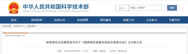 5月4日,科技部社會發展科技司發布了關於《國家綠色低碳先進技術成果目錄》公示的公告(以下簡稱《公告》)。