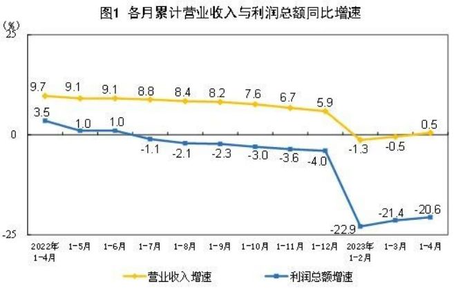 1—4月份,規模以上工業企業實現營業收入41.07萬億元,同比增長0.5%;發生營業成本34.98萬億元,增長1.6%;營業收入利潤率為4.95%,同比下降1.32個百分點。