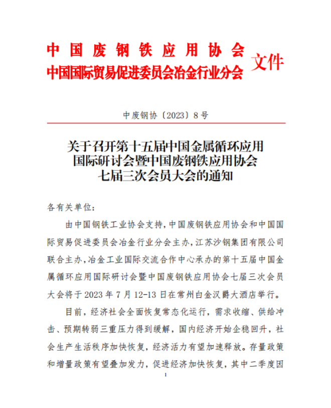 關於召開第十五屆中國金屬循環應用國際研討會暨中國廢鋼鐵應用協會七屆三次會員大會的通知