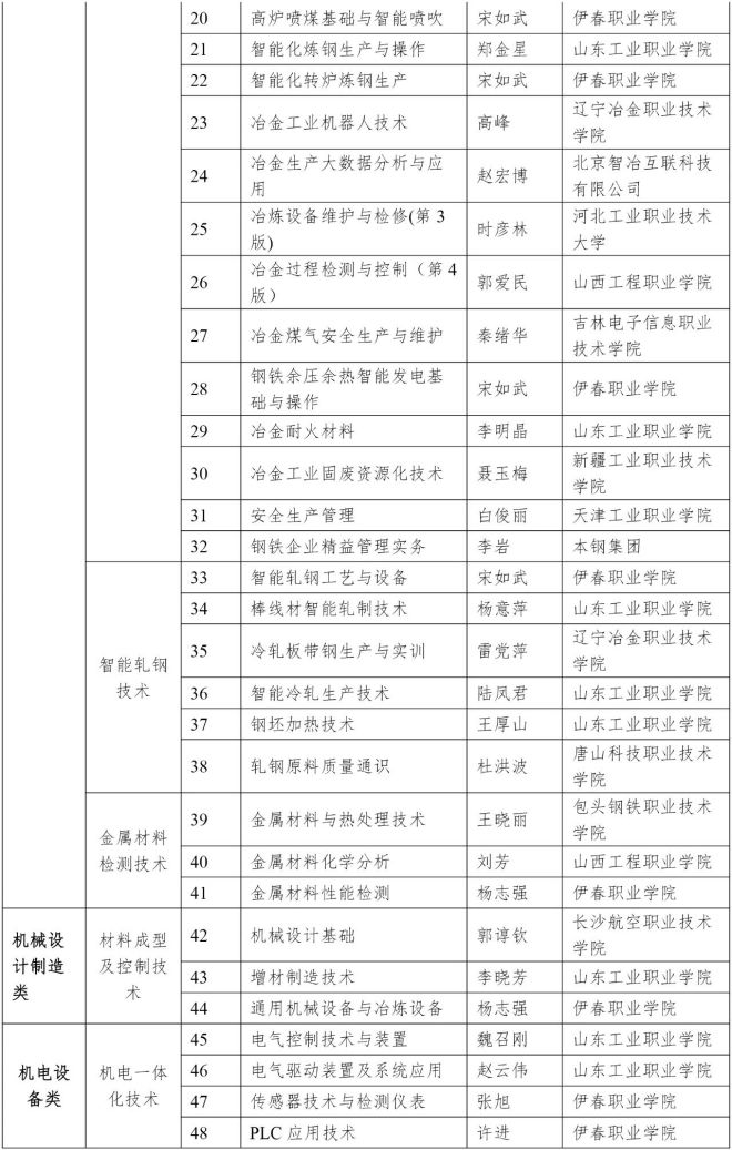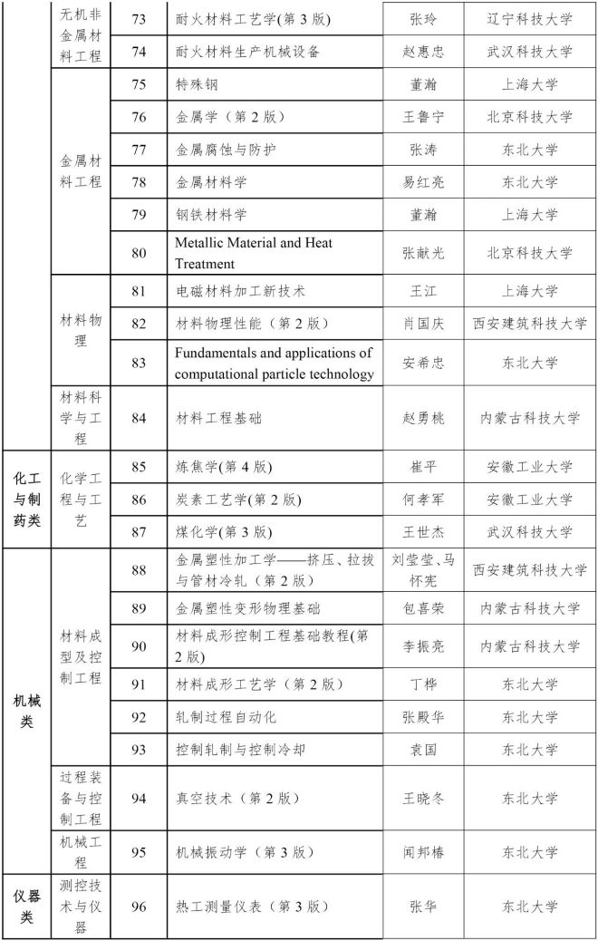 為打造精品冶金專業教材,切實提高教材建設水平,根據“冶金專業教材和工具書經典傳承國際傳播工程”(以下簡稱“經典工程”)工作安排,經單位申報、多輪評審、意見征詢、專家審定等環節,中國鋼鐵工業協會於近日公布了“經典工程”第一批立項教材書目,其中,高等教材 96 種(見附件1),職業教育教材 66 種(見附件2),具體工作由冶金工業出版社承擔。
