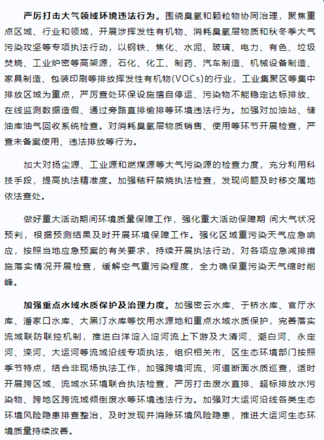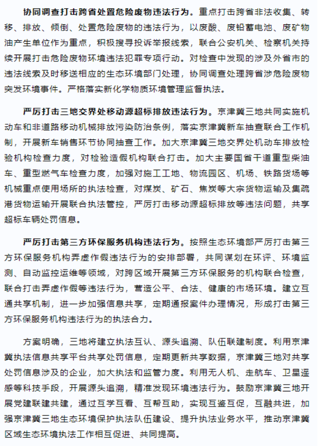 為wei深shen化hua京jing津jin冀ji生sheng態tai環huan境jing執zhi法fa聯lian動dong工gong作zuo機ji製zhi,保bao障zhang區qu域yu環huan境jing安an全quan,推tui進jin區qu域yu生sheng態tai環huan境jing質zhi量liang穩wen定ding改gai善shan,近jin日ri,京jing津jin冀ji生sheng態tai環huan境jing執zhi法fa聯lian動dong工gong作zuo領ling導dao小xiao組zu製zhi定ding了le《2023-2024年京津冀生態環境聯合聯動執法工作方案》,對2023年6月至2024年5月期間京津冀生態環境執法重點工作進行安排部署,明確將重點圍繞大氣、水、固體廢物、移動源、打擊第三方環保服務機構違法五個方麵開展聯動執法。