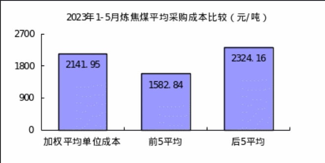 1-5月對標企業煉焦煤平均采購成本最低的前5家企業折算成幹基的加權平均采購成本為1582.84元/噸,比對標企業平均采購成本低559.11元/噸,低於平均采購成本26.10%;而采購成本最高的5家企業的加權平均采購成本為2324.16元/噸,比對標企業平均采購成本高182.21元/噸,高於平均采購成本8.51%。