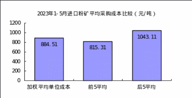 1-5月對標企業進口粉礦折算成62%品位的平均采購成本為884.51元/噸,成本最低的前5家企業的加權平均采購成本為815.31元/噸,比對標企業平均采購成本低69.20元/噸,低於平均采購成本7.82%;而采購成本最高的5家企業加權平均采購成本為1043.11元/噸,比對標企業平均采購成本高158.60元/噸,高於平均采購成本17.93%。