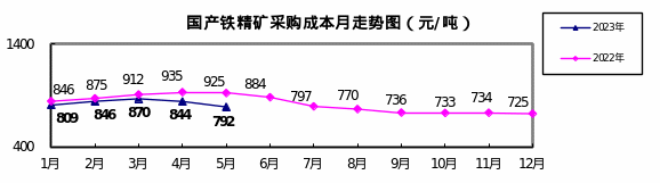 國產鐵精礦(幹基)5月份加權平均采購成本為792.30元/噸,環比下降51.57元/噸,降幅為6.11%。1-5月累計平均采購成本為833.93元/噸,同比下降60.44元/噸,降幅為6.76%。