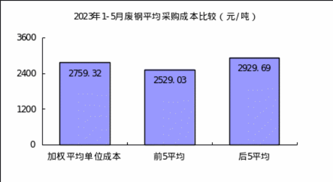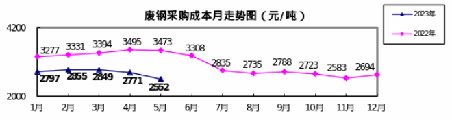 廢鋼5月份加權平均采購成本為2552.01元/噸,環比下降218.63元/噸,降幅為7.89%。1-5月累計平均采購成本為2759.32元/噸,同比下降639.71元/噸,降幅為18.82%。