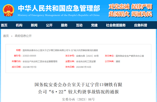 7月10日,中華人民共和國應急管理部網站發布了《國務院安委會辦公室關於遼寧營口鋼鐵有限公司“6·22”較大灼燙事故情況的通報》。