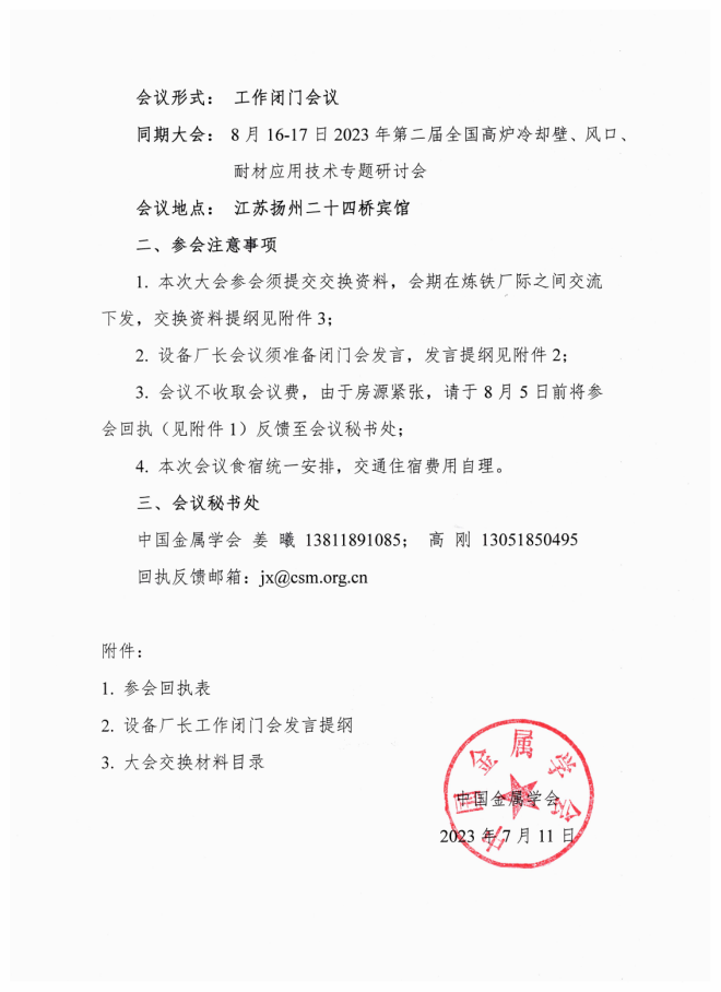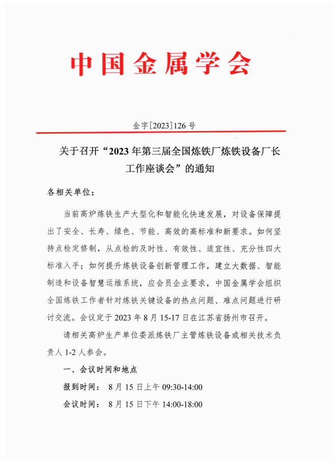 關於召開“2023年第三屆全國煉鐵廠煉鐵設備廠長工作座談會”的通知