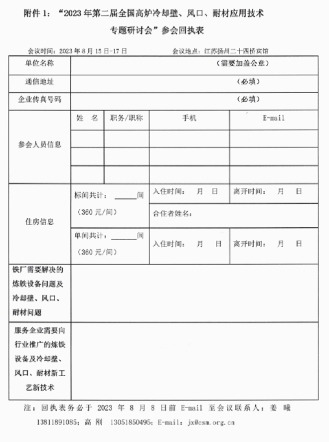 1.“2023年第二屆全國高爐冷卻壁、風口、耐材應用技術專題研討會”參會回執表