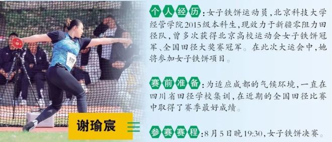 在此次成都大運會上,畢業於北科大的2名運動健兒將參加田徑項目角逐。他們曾在全國大學生田徑賽場上取得優異成績,也曾在首都高校運動會上打破塵封20餘年的賽會紀錄。他們的名字是:謝瑜宸、張悅。